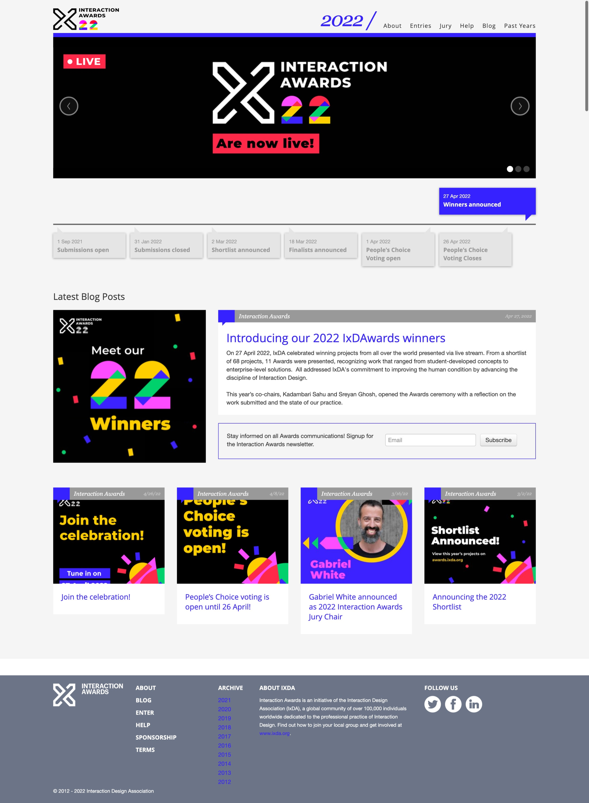 The Interaction Awards is an annual event at the culmination of Interaction Design Week, hosted by the Interaction Design Association. https://awards.ixda.org/ is where to find how to submit an entry to the Interaction Awards, the judging panel, and winners and finalist of the award categories of current and past years. The primary purpose of redesigning the Interaction Awards website was to create a more user-friendly and accessible experience.